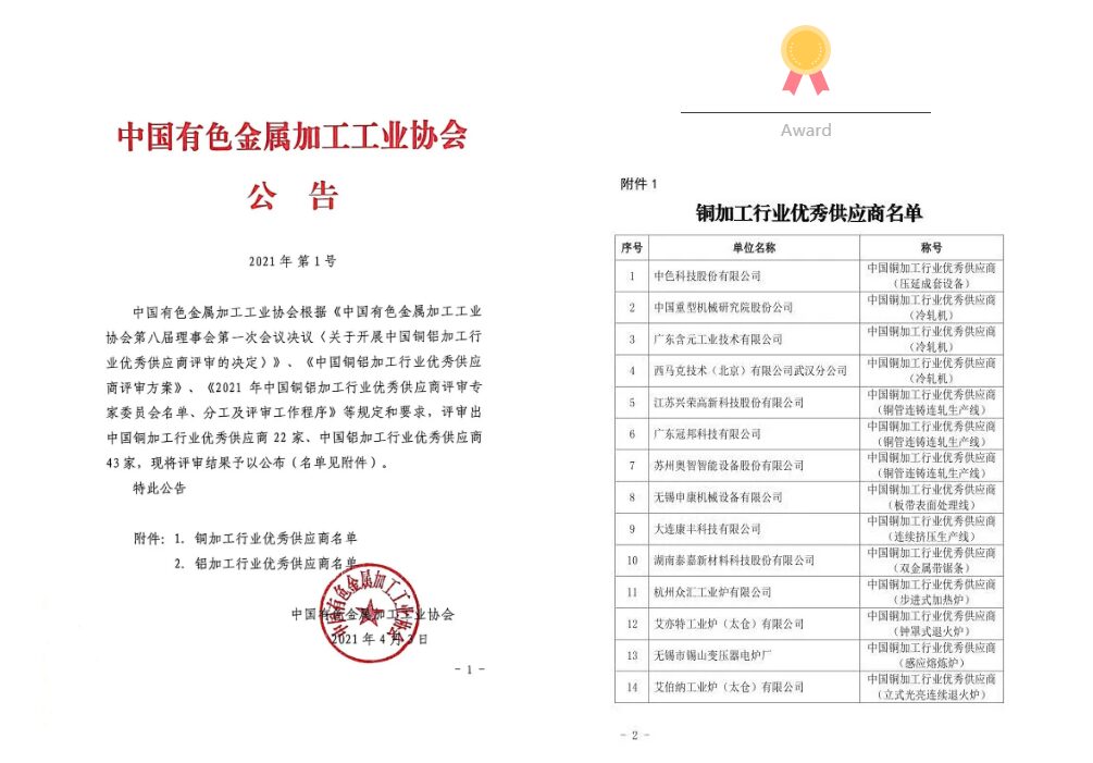 Guangdong Hanyuan Industrial Technology Co., Ltd. , based in Guangdong Industrial Design City, was named an “Outstanding Supplier in China’s Copper Processing Industry” by the China Nonferrous Metal Processing Industry Association for its quality products and technical expertise.