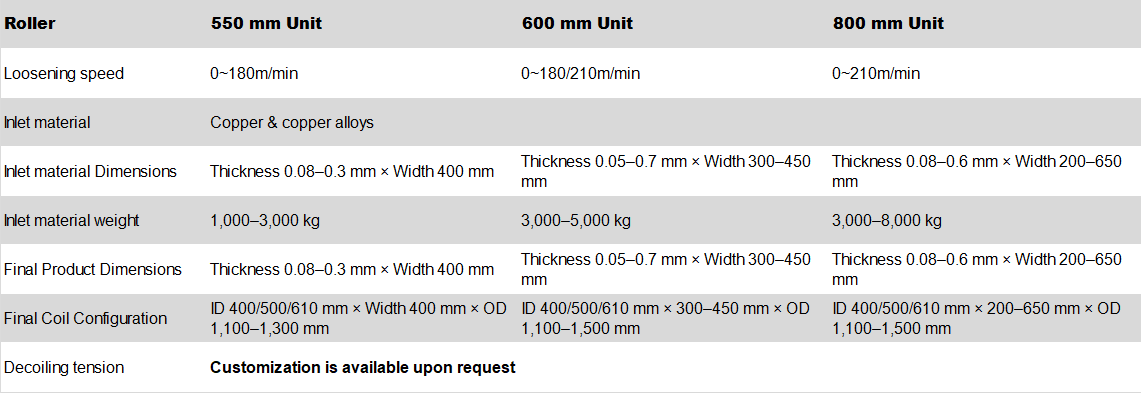 Coil Loosening Mill: Specifically engineered for decoiling copper and copper alloy coils between rolling and annealing processes, this system produces loosely-wound coils with reduced tension to prevent adhesion during heat treatment.